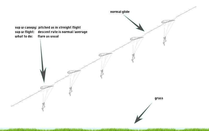 Hot air that usually comes up from a tarmac, lifts your canopy while changing its pitch slightly up. Since pitch is our main gas pedal our air speed also start decreasing (hate that feeling). However even worse what happens next since “what comes up must always come down”. When your canopy finally flies over a thermal it suddenly loses the upward going push created by the the thermal. This causes the canopy to pitch down more aggressively than in normal flight. The descent rate increases while the canopy is trying to gain its speed equilibrium back. So here you are descending faster than normal very close to the ground.